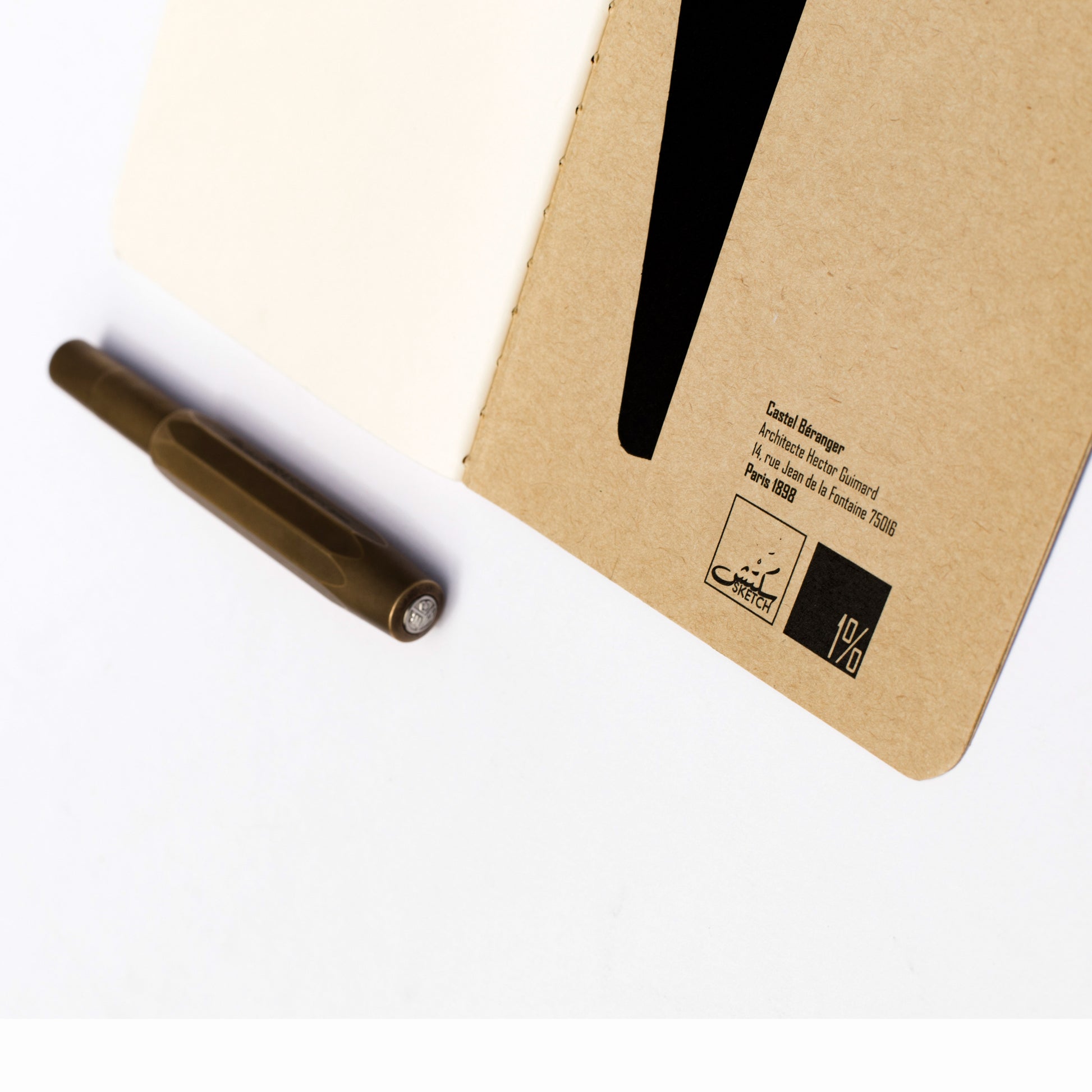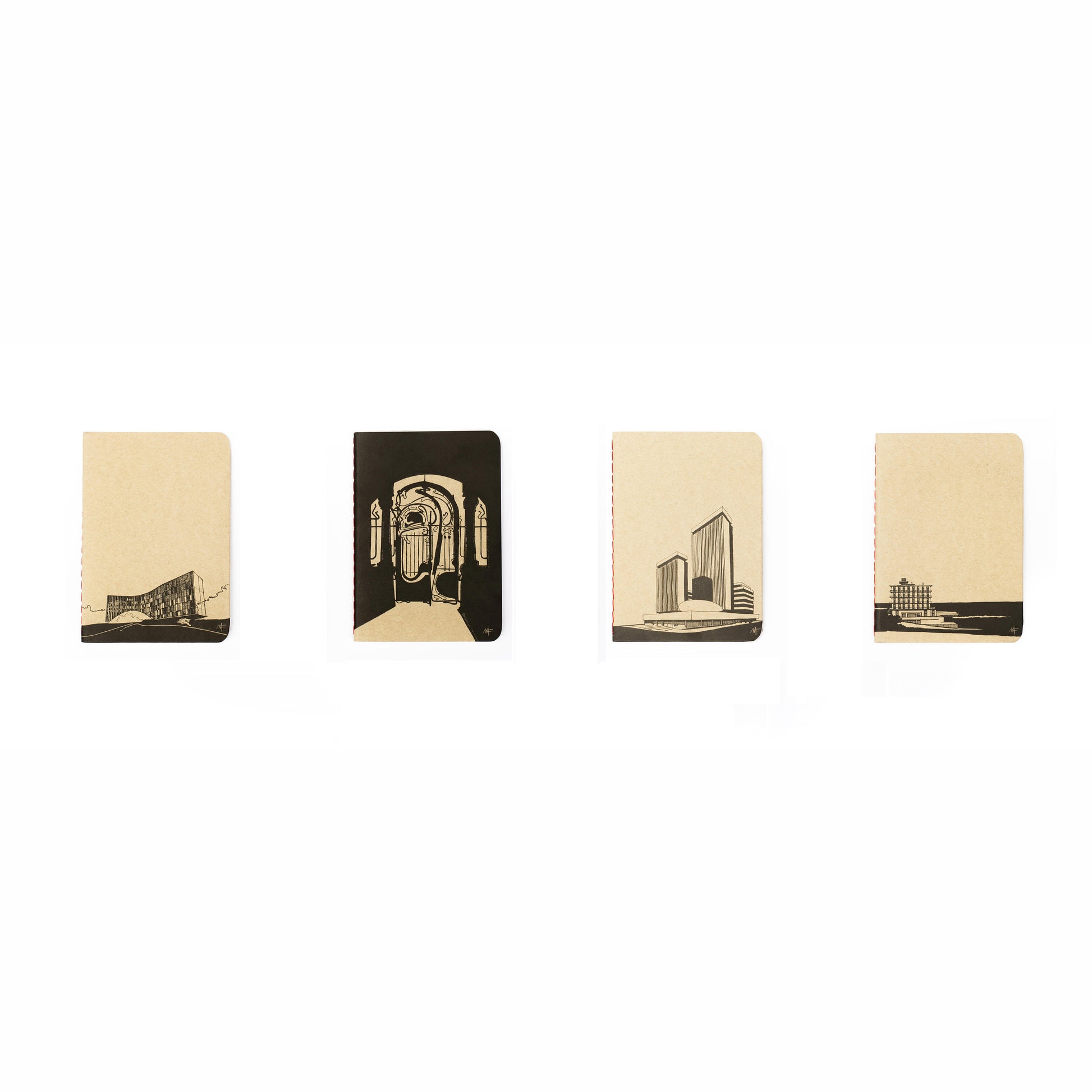 Ces carnets de croquis rendent hommage aux architectes modernistes avec leurs illustrations en couverture de croquis de créations architecturales célèbres. Croquis réalisés à la main à l’encre de chine sur couverture en kraft, impression offset, reliure cousue à la main, avec pochette intérieure et inscription explicative.